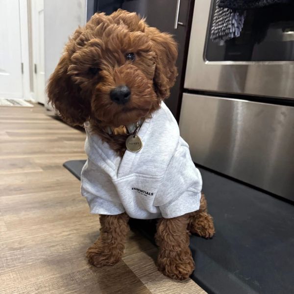 Our sweet Scarlett! Scarlett was born June 12th, 2020. Scarlett has a sweet and peppy personality. She loves playing fetch and laying on her back for for a belly rub. Aside from those things Scarlett is a great mom to her puppies. We breed Scarlett to a mini poodle named Mario. Scarlett and Mario tend to throw darker colors together.